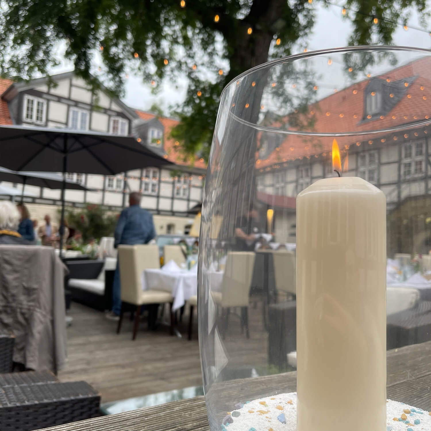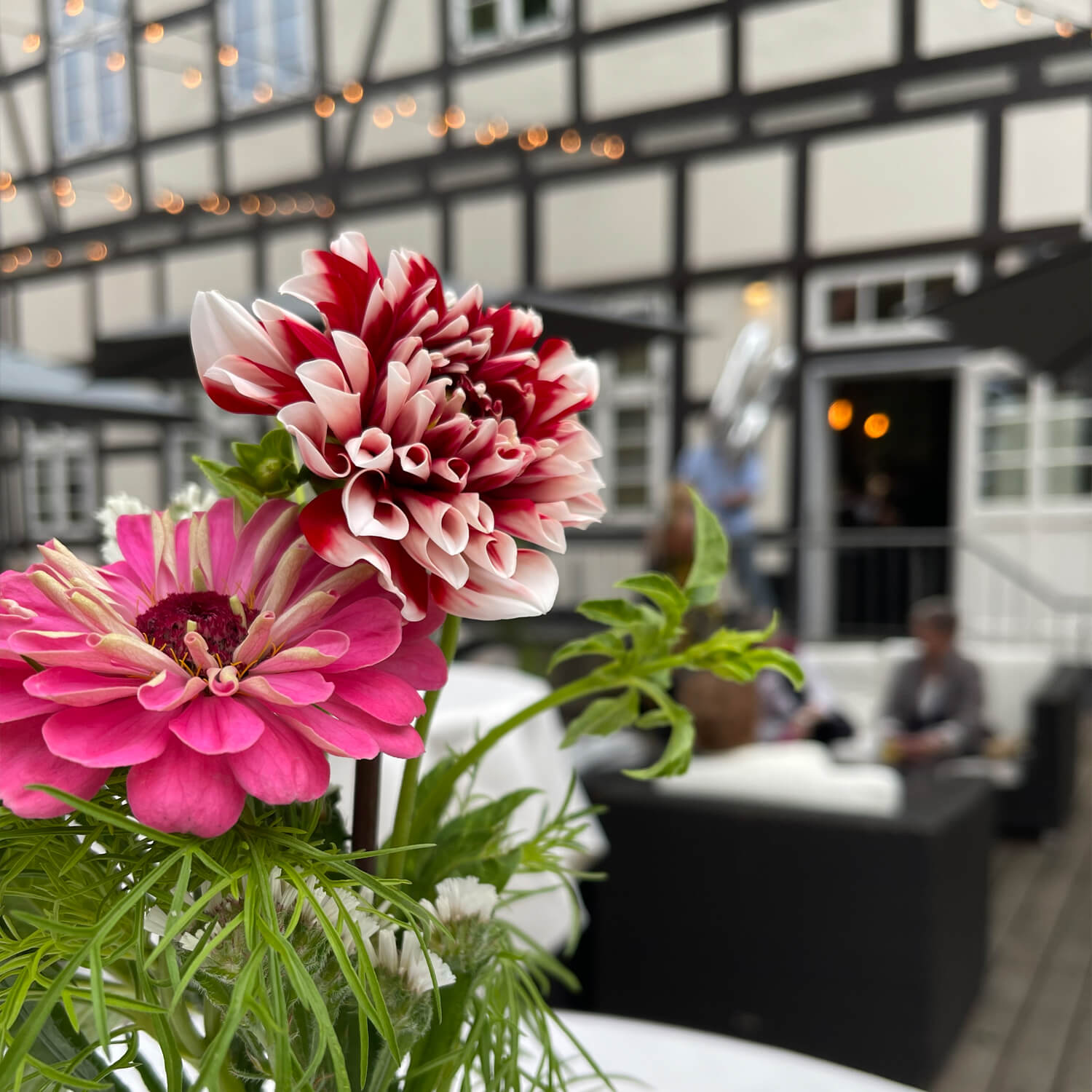 Aber hier geht es um weitaus mehr, als zu kellnern, Gäste mit Getränken zu versorgen, ein Menü auf den Teller zu zaubern oder das Hygienekonzept einzuhalten. Unsere guten Gastgeber kümmern sich um mehr als das. Unser wundervolles Team hat den Erlebniswert im Kopf und achtet auf den Flow der Veranstaltung. Am Ende bleibt nur die Erinnerung an diesen Abend. Und die muss einfach nur toll sein! Darum denken unsere Mitarbeiter wie Entertainer, Wünscheerfüller, Dekorationstalente, Küchenhelden und Planungsgenies. Es ist auch heute wieder spürbar, wie das ganze Team Hand in Hand zusammenarbeitet, um den Gästen ein unvergessliches Ereignis zu ermöglichen. Nach und nach trudeln auch schon die ersten Gäste ein und versammeln sich freudig auf dem Innenhof. Ein Haufen herzlicher Menschen, die gemeinsam einen ganz besonderen Grund zum Feiern haben.