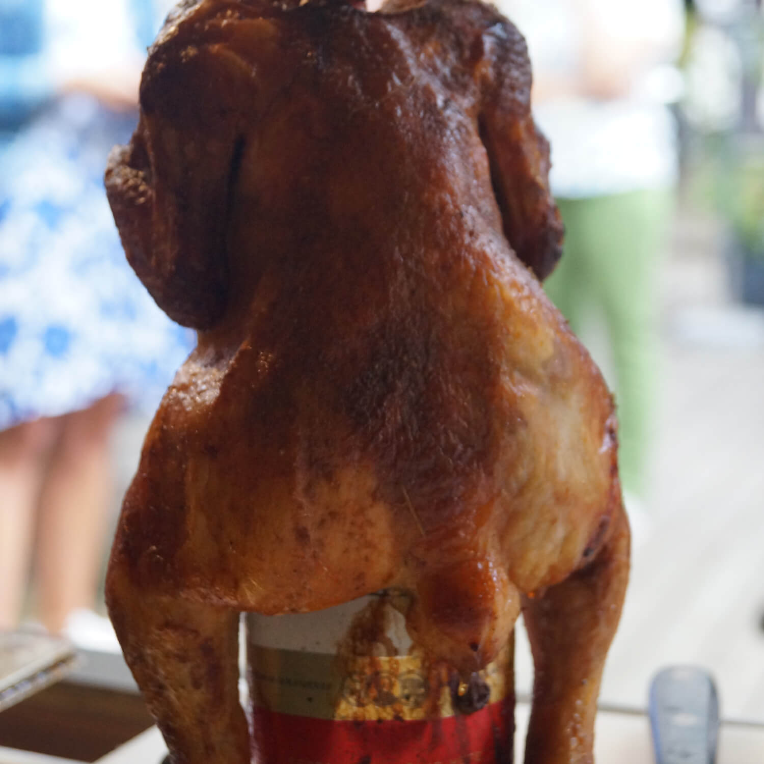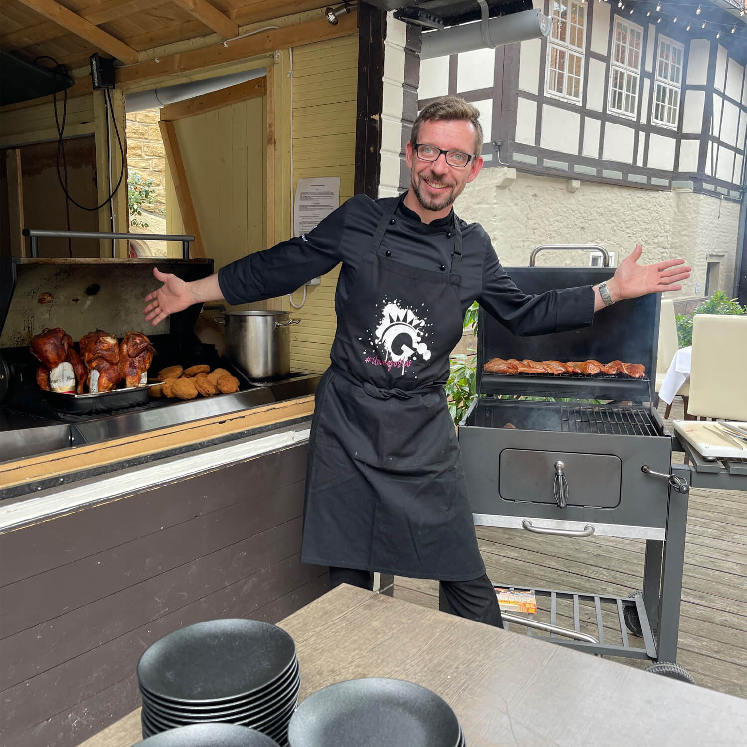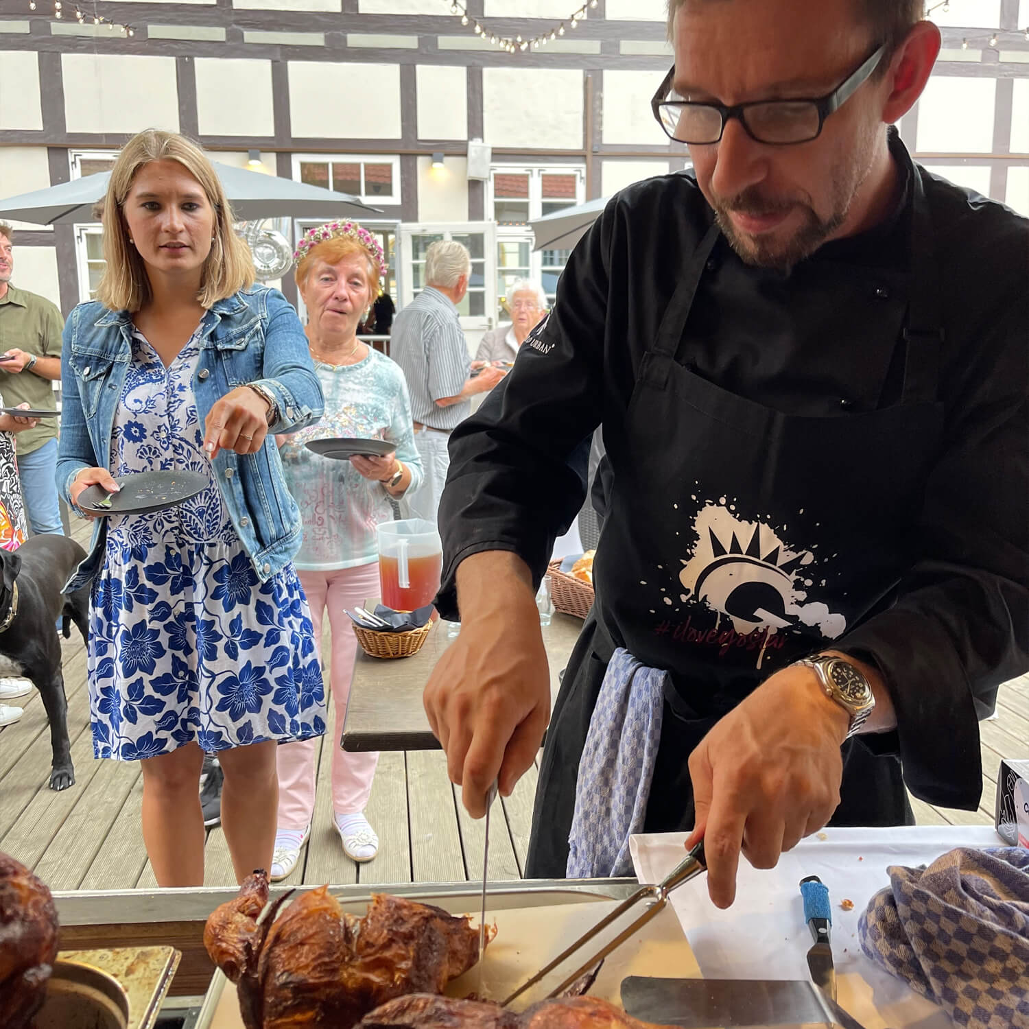 Jeder Handgriff und jedes noch so kleine Details haben diesen ohnehin schon schönen Ort in eine romantische Location verwandelt und ich bin mir sicher, dass man diesen zauberhaften Tag so schnell nicht vergessen wird. In meinem Augenwinkel sehe ich Kevin am Grill hantieren und schaue daraufhin nach, was er da macht. „Na Kevin, was machst Du da?" frage ich ihn gespannt, während er konzentriert das Fleisch auf dem Grill wendet. „Ich smoke hier gerade Schweinefilet! Das servieren wir dann später unseren Gästen als kleinen Appetitanreger mit etwas Brot. Auf diesem Grill verbirgt sich aber das wahre Highlight!" lächelt er mir zu und öffnet zu seiner linken einen weiteren Grill, auf dem viele kleine Hähnchen auf Bierdosen sitzen und vor sich hin schmoren, das zarte Roastbeef Farbe angenommen hat. „Das duftet ja lecker!" schmunzle ich und bin erstaunt, wie viel Liebe und Ideenvielfalt Kevin in das kulinarische Angebot dieser Veranstaltung steckt.