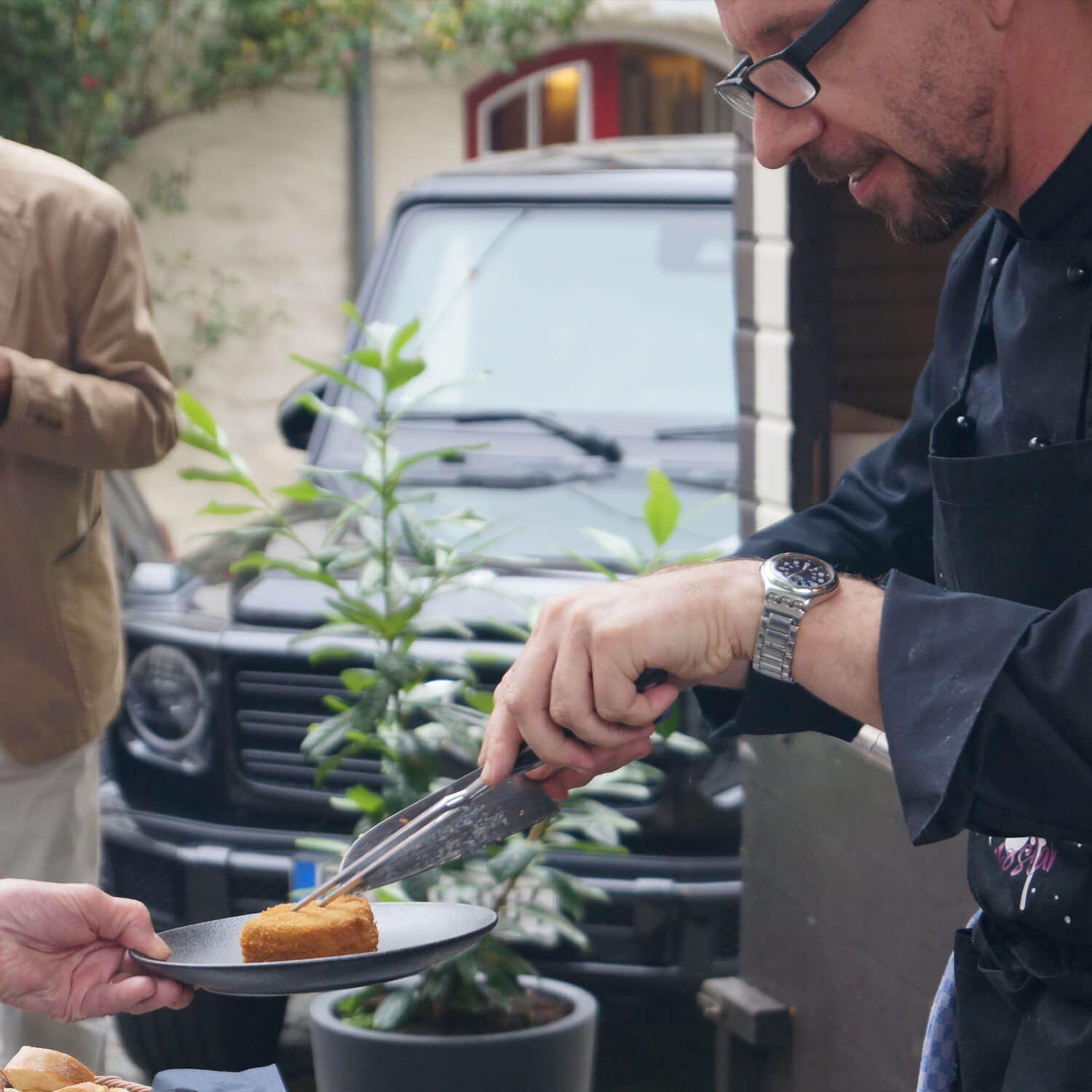 Während sich die Gäste begrüßten und einander austauschten bereitete Kevin den Empfangssnack vor und hatte dabei natürlich reichlich Unterstützung vom A-Team! Alex und Albert schlawinerten um den Grill herum und konnten es kaum abwarten, dass es endlich los ging. Der gesamte Innenhof des Schiefers roch unwiderstehlich gut und wirklich jeder warf Kevin einen hungrigen Blick zu. Ein paar Meter weiter waren Hend und Patrick bereits in ihrem Element und ließen bei den Gästen keine Wünsche offen. Alles wirkte so harmonisch und leicht. Und genau das ist es, was wir erreichen wollen. Es ist uns wichtig, dass wir einen reibungslosen Ablauf gewährleisten können und sich jeder abgeholt fühlt. Jeder soll sich rundum umsorgt fühlen und beseelt nach Hause gehen. Jeder individuelle Wunsch wird ernst genommen, um das bestmögliche Erlebnis zu erschaffen.