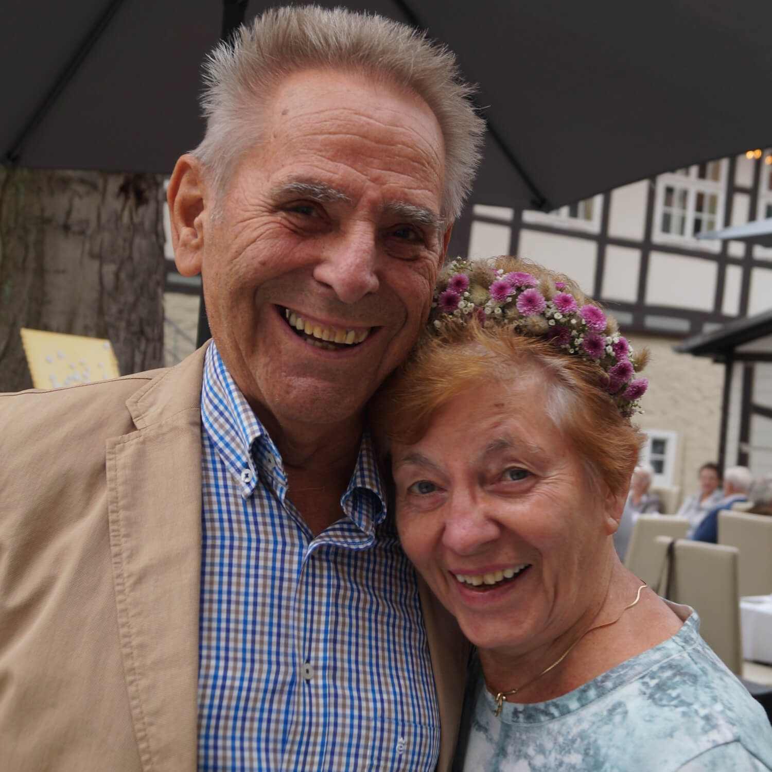 Kurz Zeit später geht es auch schon los. Alle Gäste schnappten sich gelbstrahlende Sonnenblumen und gruppierten sich gemeinsam auf dem Innenhof. Die Überraschungsgäste kamen. Und dann fühlte es sich für eine Zeit so an, als wäre alles um einen herum egal. Als sei alles nichtig und nur dieser Moment würde zählen. Gespannt schauten alle auf die kleine Gasse zwischen Schiefer und Touristinformation und sahen dem nichtsahnenden Überraschungsgästen entgegen. Zwei Menschen, die schon von weitem so herzlich und glücklich wirkten, dass sich dieses tiefe Gefühl von Zufriedenheit ganz automatisch in mir einstellte. Zwei Menschen, die das Leben an diesem Tag seit bereits 60. Jahren Tag für Tag miteinander verbrachten. Zwei Menschen, die sich an den Händen hielten und dankbar ihr Enkelkind Alena ansahen, die übrigens der Lockvogel an diesem Tag war.