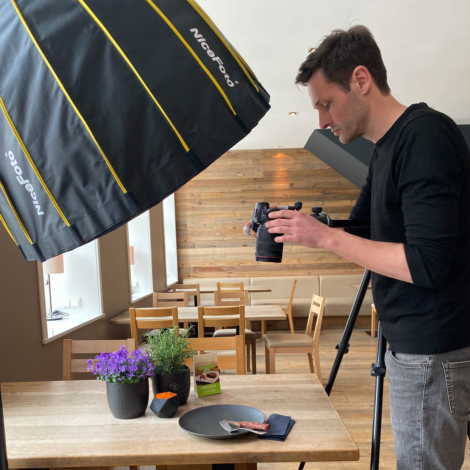 Liebe kann man fühlen, aber wusstest du eigentlich auch, dass man Liebe schmecken kann? Und Liebe kann man nicht nur fühlen oder schmecken, sondern auch sehen. Wie wir das umsetzen kann und wie eine Orange den Weg zu einer nachhaltigeren Arbeitsweise ebnet, liest du heute in unserer Lovestory. Mittwochmorgen, 9:00 Uhr: Mit Masken bewaffnet und natürlich negativ getestet beginnt das heutige Team seine Arbeit während des Lockdowns. Während ich Steffen dabei helfe seinen Shooting-Spot im Restaurant des Schiefer aufzubauen, um für unsere Kampagnen neues Bildmaterial unserer Steaks aufzunehmen, höre ich, wie es in der Küche schon fleißig zur Sache geht und sich das heutige Küchenteam auf seine Arbeit vorbereitet. Detailverliebt und fürsorglich drapiert Steffen einen Blumentopf mit kleinen lila Blüten und einen saftigen Busch Rosmarin auf unserem Fototisch. „Vielleicht noch ein kleines Teelicht…“ murmelt Steffen vor sich hin und setzt weitere Kleinigkeiten in Szene, während er immer wieder checkt wie das Gesamtbild auf der Kamera wirkt. „Das Steak soll sich ja schließlich auch wohlfühlen.“ blinzle ich Steffen zu und wir beide fangen an zu lachen.