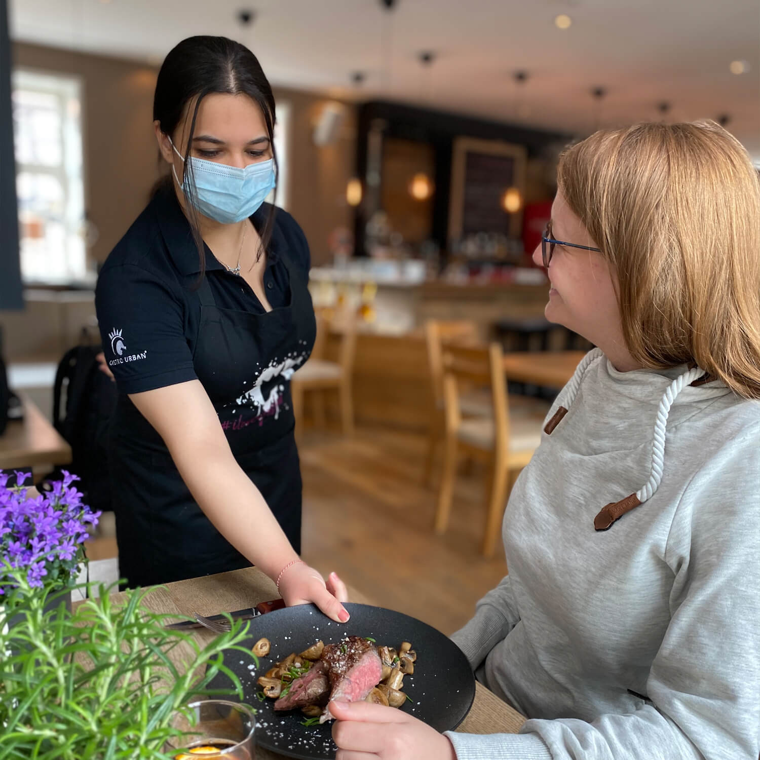 Zufrieden und wahnsinnig inspiriert von Kevins Worte schreite ich aus der Schiefer Küche auf meinen Kollegen Steffen zu, der bereits dabei ist, ein saftiges Steak in eine optimale Szene zu setzen. „Wo ist eigentlich der andere Teller?" fragt er Jana, die heute als Handmodel mitwirkt und ebenfalls verwundert in der Gegend rumschaut. "Kleine Kostprobe!" schmunzelt Alexander und genießt mit einem breiten Grinsen im Gesicht ein paar Streifen Steak. „Ich glaube, Albert wäre auch nicht so ganz abgeneigt." sagt Steffen und schaut unseren tierischen Freund auf vier Pfoten mitleidig an. Auf der anderen Seite des leergefegten Restaurants gibt Tina alles, um einer weiteren kleinen Gruppe Azubis bei dem Schulstoff nachzuhelfen. Aufgrund der Pandemie erhalten sie weitaus viel weniger Lehrmöglichkeiten in der Praxis als es überhaupt verkraftbar ist. Umso motivierter sieht das Team sich, den Azubis mit viel Fachwissen zur Seite zu stehen, um einen optimalen weiteren Verlauf der Ausbildung zu gewährleisten. Vor allem ist das deshalb so wichtig, weil ein Teil der Azubis bereits vor den Abschlussprüfungen steht. Getreu dem Motto: „Keiner ist allein und jeder ist für jeden da!“ Während Kevin bereits das Mittagessen für das Team anrichtet, neigt sich so langsam der Pandemie Alltag in den vier Wänden des Schiefers dem Ende zu. Wir haben wieder mit viel Liebe zum Detail und einer Menge Optimismus für unsere Branche gezeigt, dass es um weitaus mehr als nur "essen gehen" geht. Gemeinsam und Hand in Hand für mehr Wertschätzung im Gastgewerbe. Selbst ohne Gäste und während des Lockdowns eine Herzenssache.